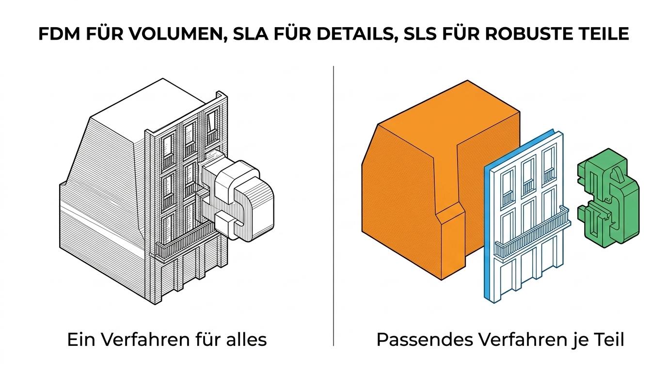 Schritt 2: Ordnen Sie die Geometrie dem Verfahren zu. Feine Fassaden, Treppen, Geländer und transparente Details sprechen meist für SLA. Große Volumenkörper oder Rohmodelle passen häufig zu FDM. Steckteile, Clips oder belastete Kleinserien landen oft bei SLS.