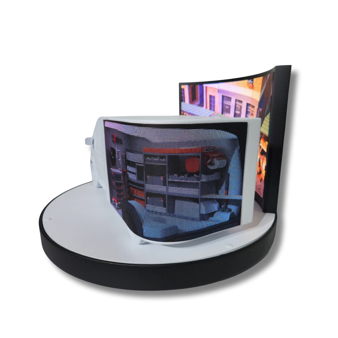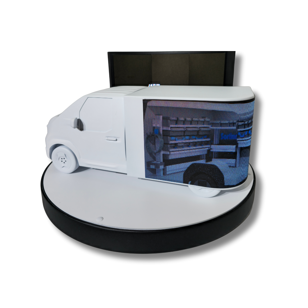 Der im Heckbereich integrierte digitale Bildschirm wurde speziell von ari maquette umgesetzt. Die LED-Anwendung verwandelt das Modell von einem statischen Ausstellungsobjekt in ein dynamisches Präsentationsmedium. Die elektronischen Komponenten wurden verdeckt installiert, ohne die innere Struktur zu beeinträchtigen.